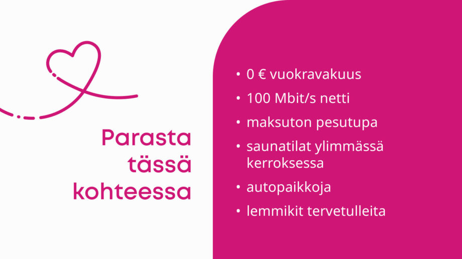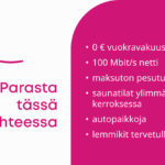 100 M nettiyhteysAuton säilytys: autopaikka ja sähköpistoke Vakuus: 0 € Vesimaksu: 28 €/hlö/kk Autopaikka: autopaikka 16 €/kk Yhtiön vuokravastaava: Asuntokanava
