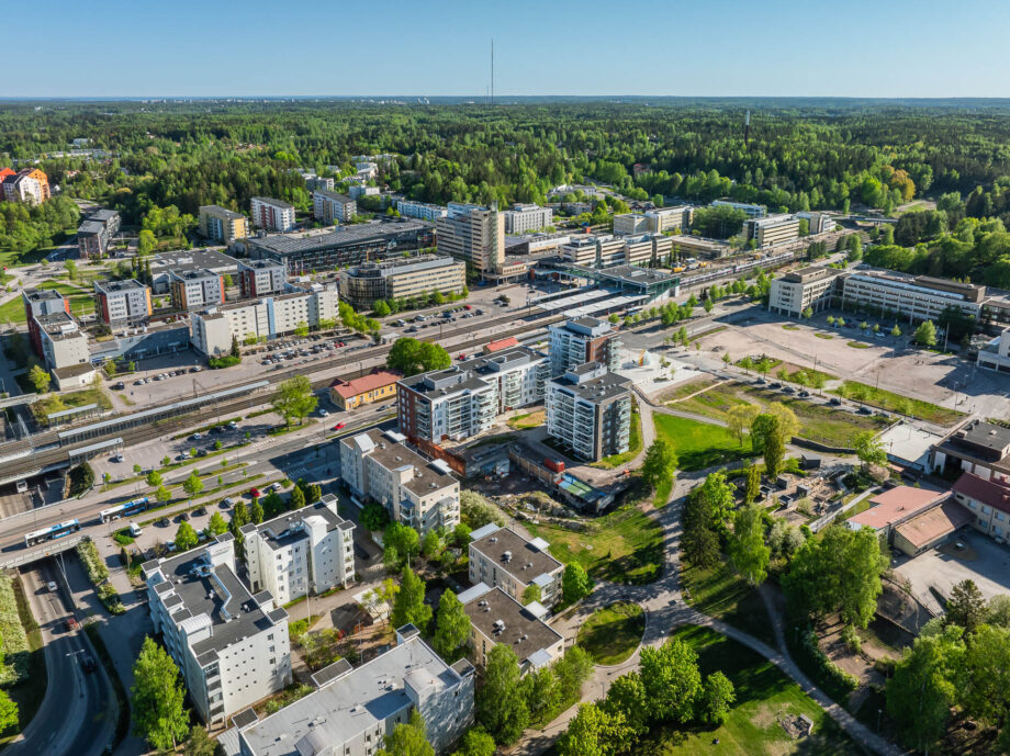 Espoon keskuksen juna-asemalle on matkaa parisataa metriä ja lähin bussipysäkki on aivan talon vieressä.