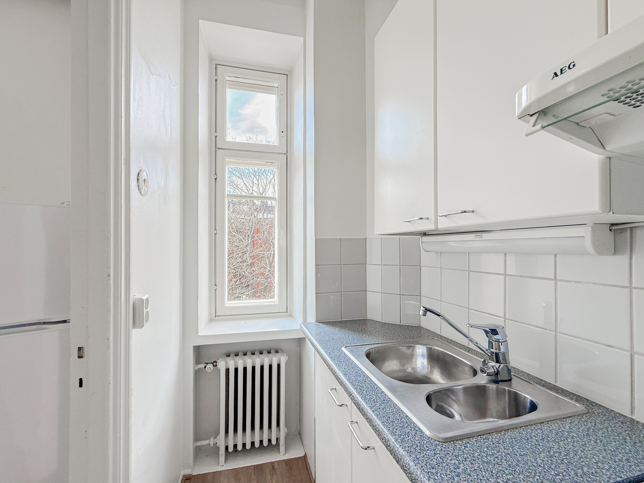 Yksiö valoisalla keittokomerolla. Kodissa laminaattilattiat ja hiljattain uusittu kylpyhuone.