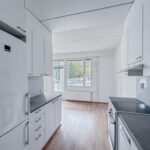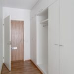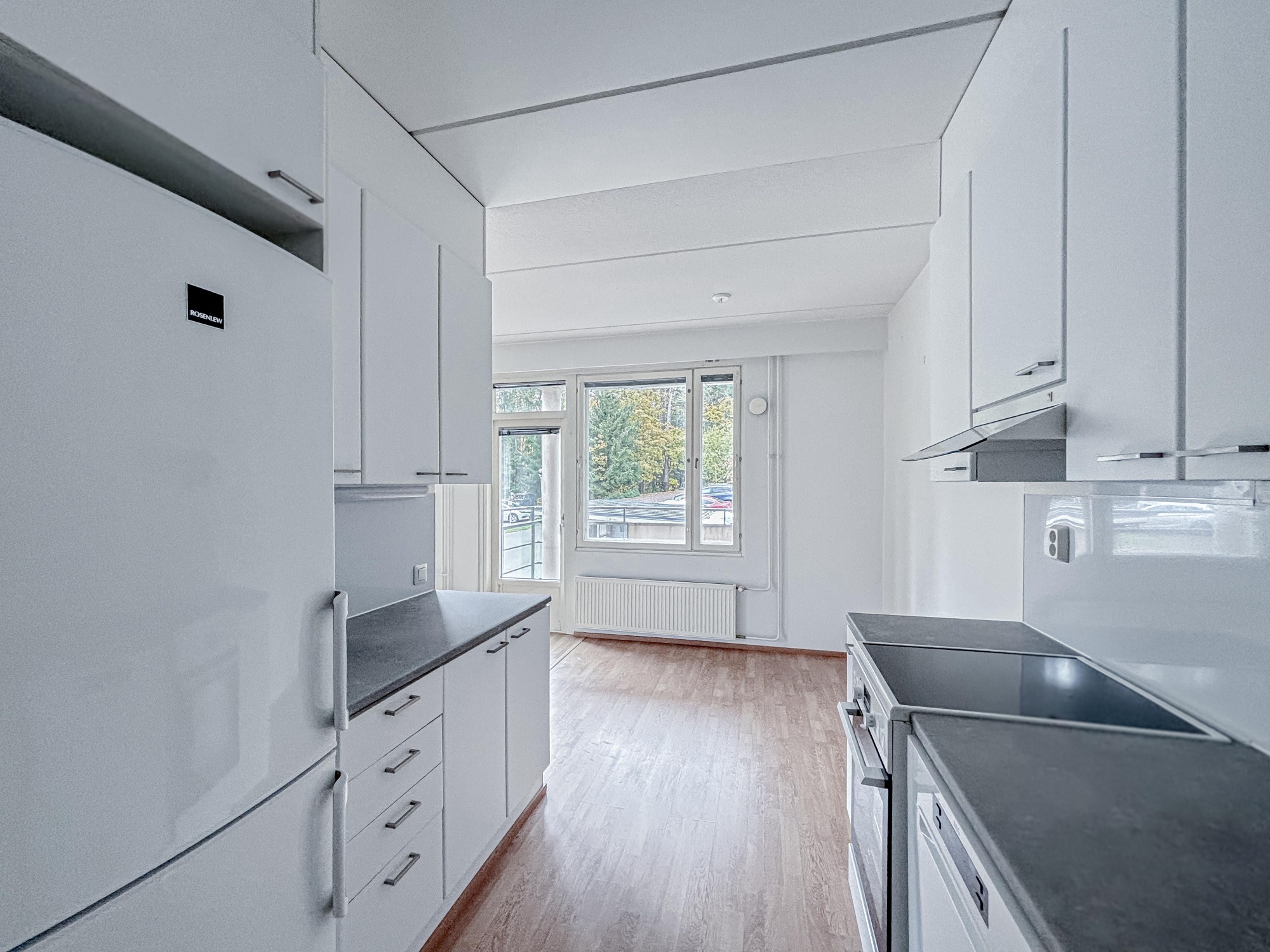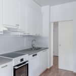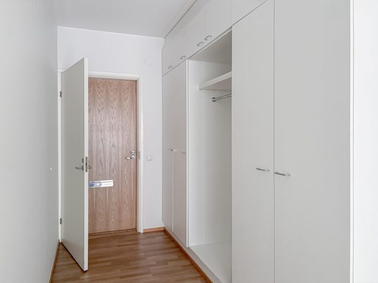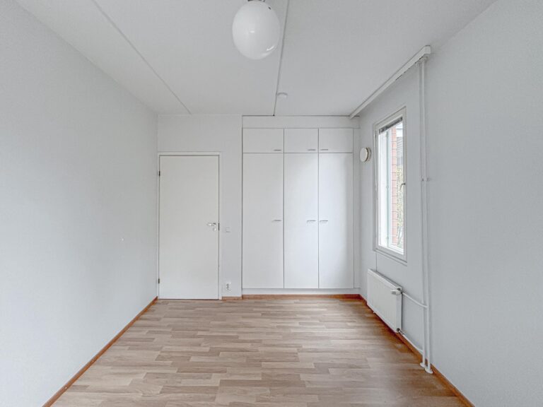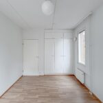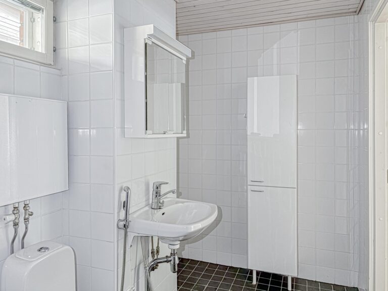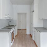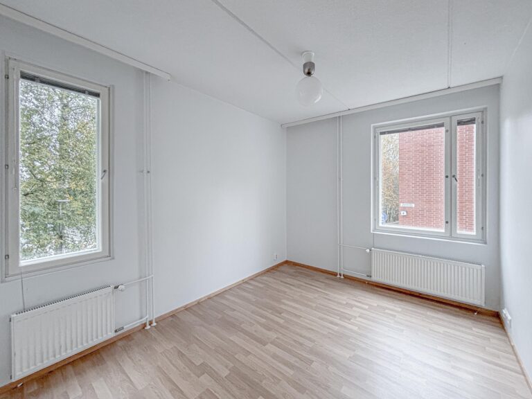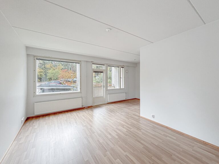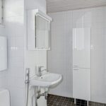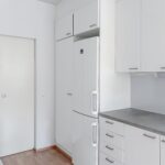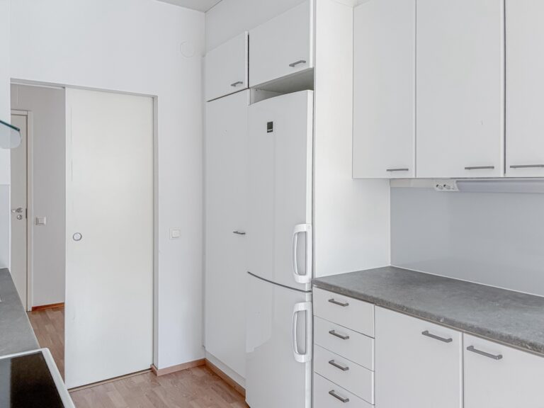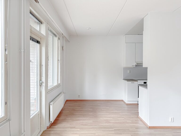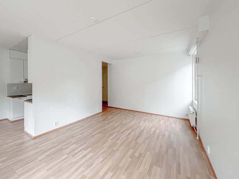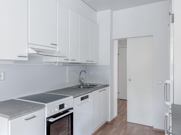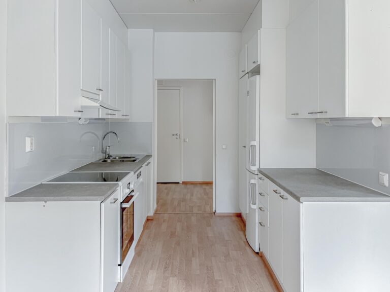 Lattia on laminaattia, seinät valkoiset -maalatut, keittiössä astianpesukone, induktioliesi, jääkaappi-pakastin. Kylpyhuone on laatoitettu.