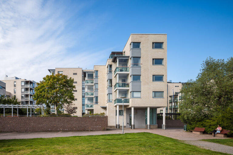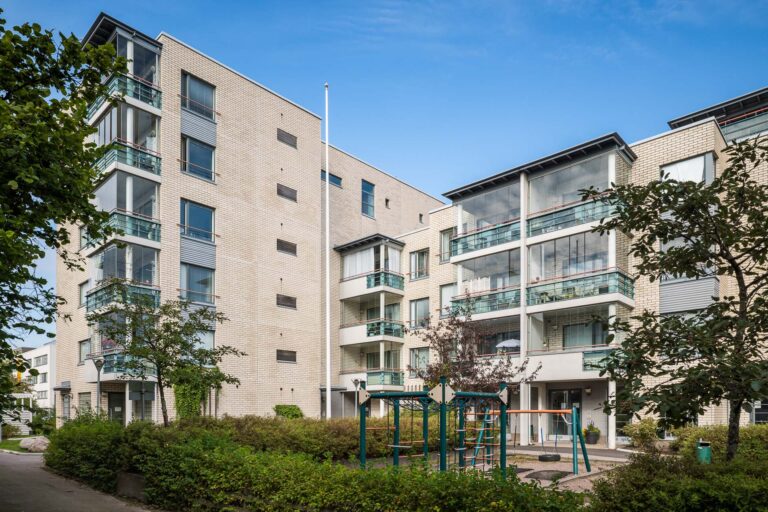 Saunallinen kaksio kolmannessa kerroksessa. Kodin lasitettu parveke suuntautuu etelään sisäpihalle. Ilmoituksen kuvat vastaavantyylisestä kodista (peilikuva).