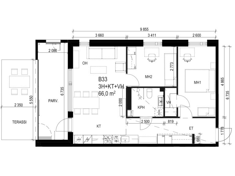 Avara ja valoisa kolmio, jossa arki sujuu vaivattomasti. Tilava vaatehuone helpottaa säilytystä, ja mukavan iso lasitettu parveke yhdistettynä omaan terassiin tarjoaa lisätilaa rentoutumiseen tai yhdessäoloon. Modernit kodinkoneet ja viilennys tekevät asumisesta miellyttävää vuoden ympäri.