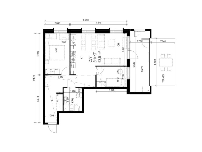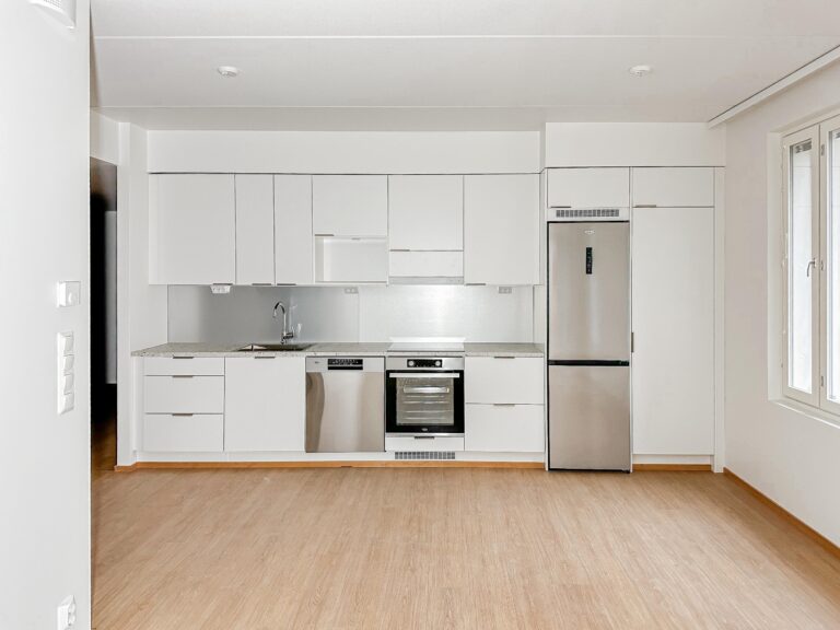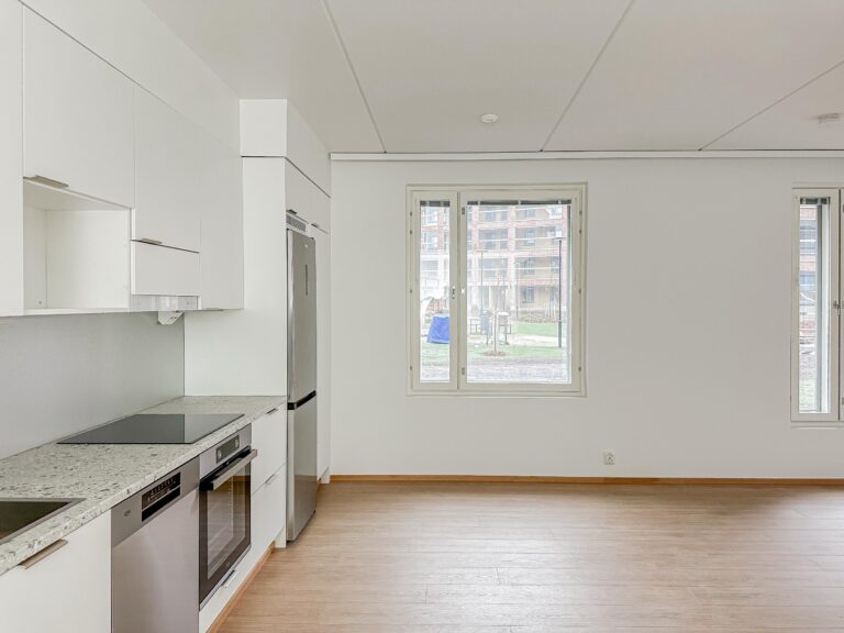 Kodissa on avara olohuone ja keittiö, jossa laadukkaat kodinkoneet tekevät ruoanlaitosta helppoa. Ihanan suuri lasitettu parveke omalla terassilla tarjoaa runsaasti tilaa oleskeluun ja yhdessäoloon. Viilennys pitää asunnon miellyttävänä myös lämpiminä päivinä.
