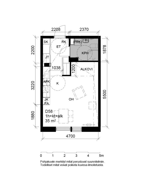 Sisäpihalta 2. kerroksen yksiö alkovilla. Peilikaapistoissa on hyvin säilytystilaa ja oma pyykinpesukone mahtuu kylpyhuoneeseen. Asunto viilenee maaviileällä kesäaikaan.