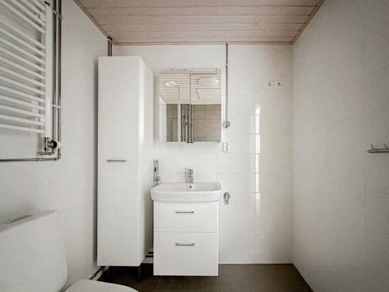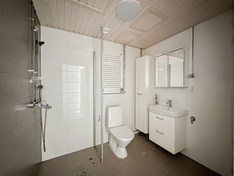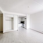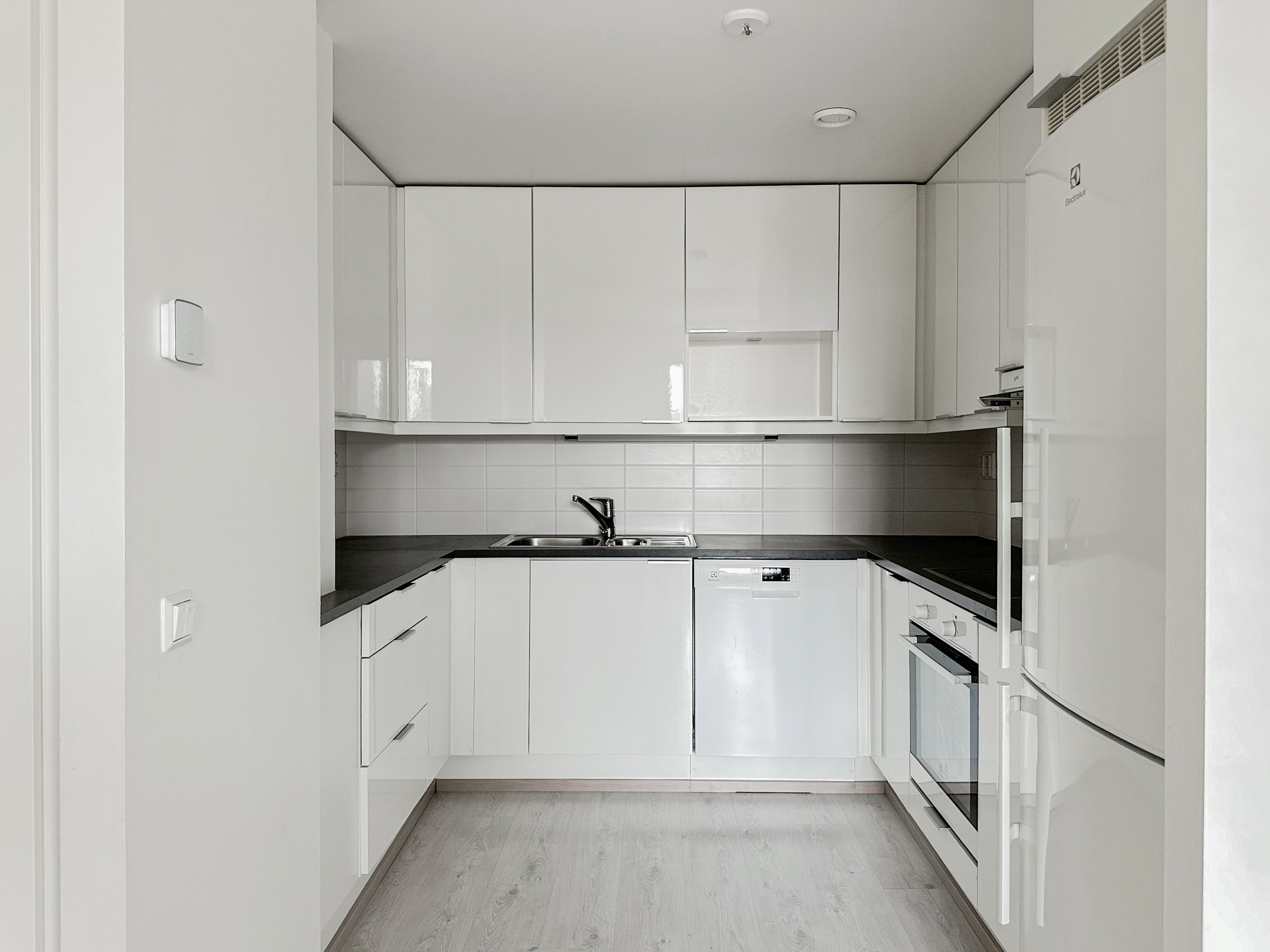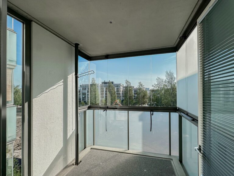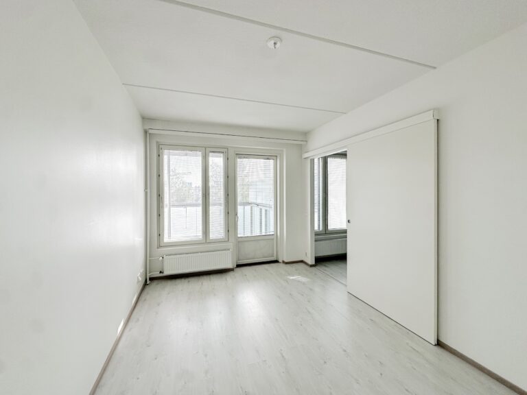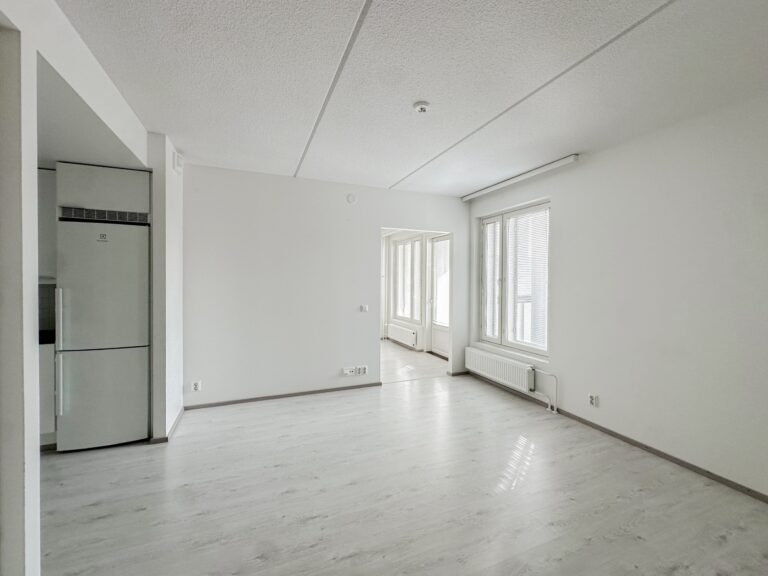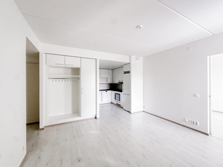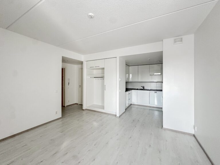 Tässä ylimmän kerroksen kaksiossa on tilava pohjaratkaisu, jonka vaalea yleisilme ja säilytyspulmat kertaheitolla ratkaiseva vaatehuone luovat viihtyisät puitteet kodikkaaseen asumiseen.