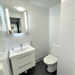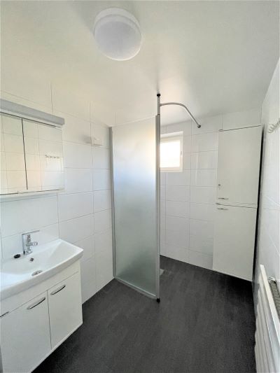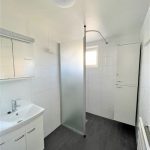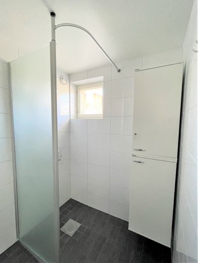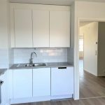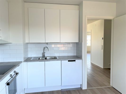 Tässä kodissa on valkoiset keittiönkaapit ja kaappien välitila on tiililadonnalla tehty valkoisista laatoista, mikä luo raikkaan ja modernin ilmeen. Keittiöstä löytyy liesitaso, erillinen uuni, astianpesukone ja jää/pakastinkaappi, sekä varaus mikroaaltouunille. Kylpyhuoneessa on tilavaraus pyykkikoneelle ja kuivausrummulle, ja sekä lattiat että seinät ovat laatoitetut. Arkea helpottaa myös erillinen wc kylpyhuoneen lisäksi.