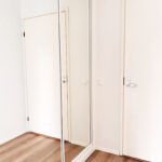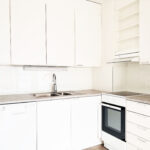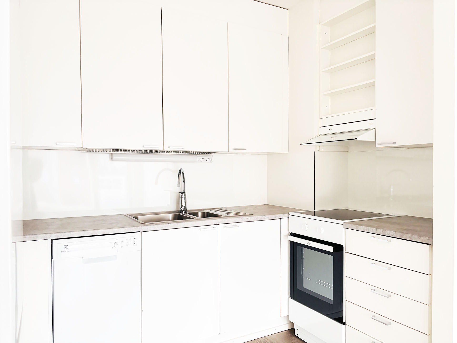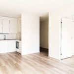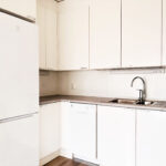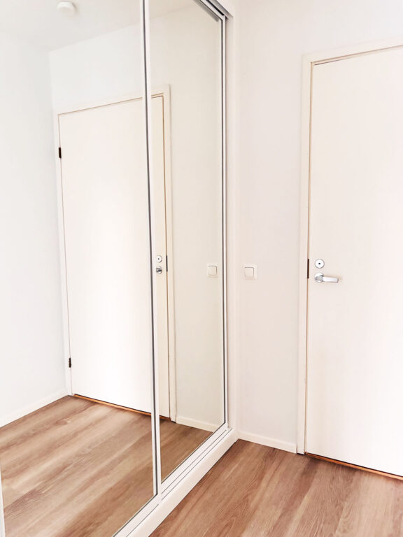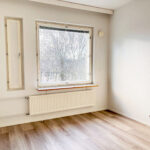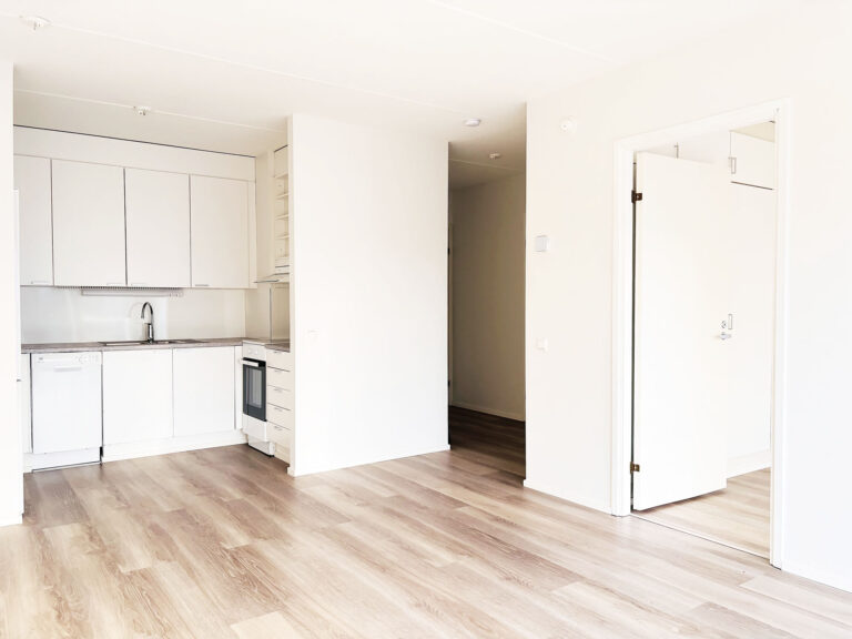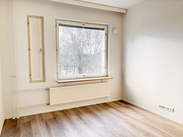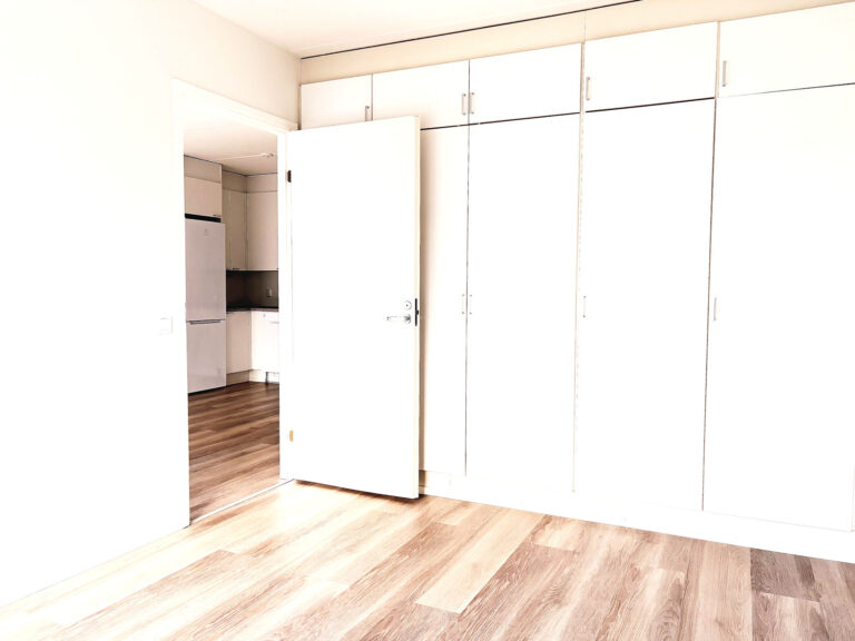 - Vaalea vinyylilankkulattia ja valkoiseksi maalatut seinät luovat raikkaan ja modernin ilmeen.