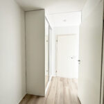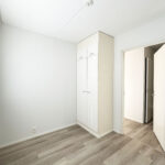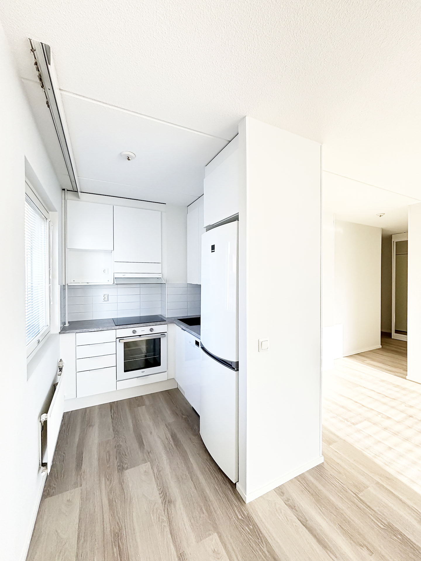 Keittiötila on remontoitu:  astianpesukone, liesitaso ja erillinen uuni, jääkaappi-pakastin ja astianpesukone. Kylpyhuone on remontoitu. Huoneiston lattiat ovat vinyylilankkua, seinät ovat valkoiset, maalatut. Vaatehuone. Eteisessä peililiukuovellinen kaapisto.