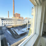 Parvekkeelta jokinäkymä. Keittiöstä näkymät rauhalliselle sisäpihalle. Makuuhuone ja olohuone on Crichtoninkadun suuntaan.